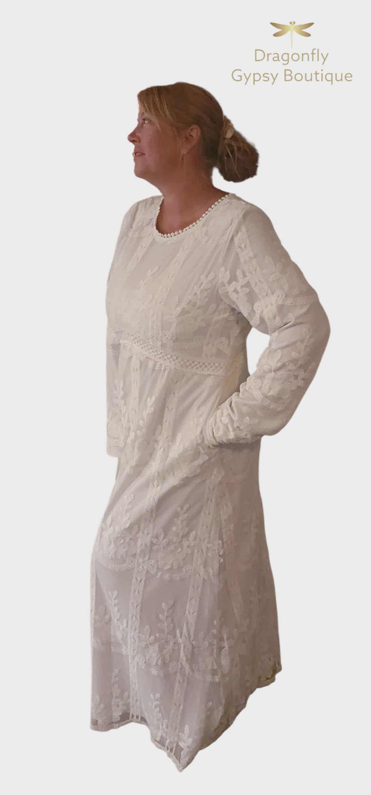 White lace temple dress with back zipper and pocket