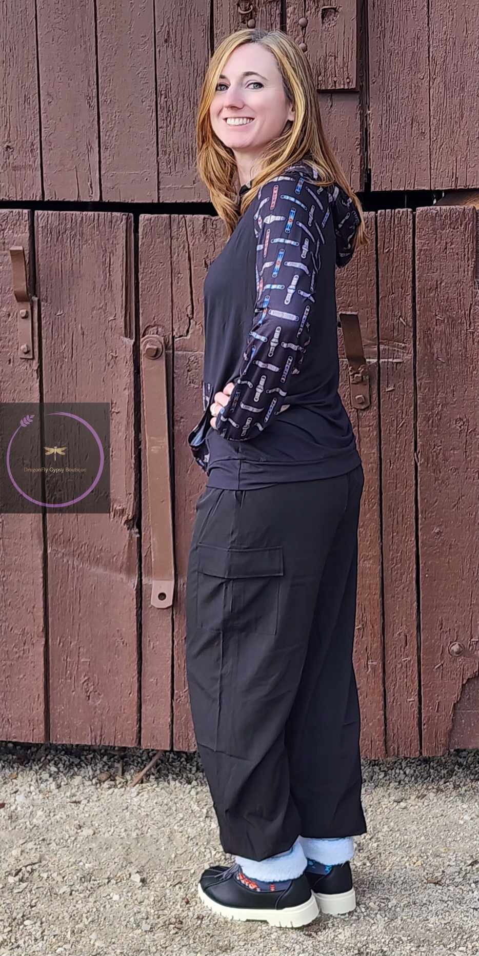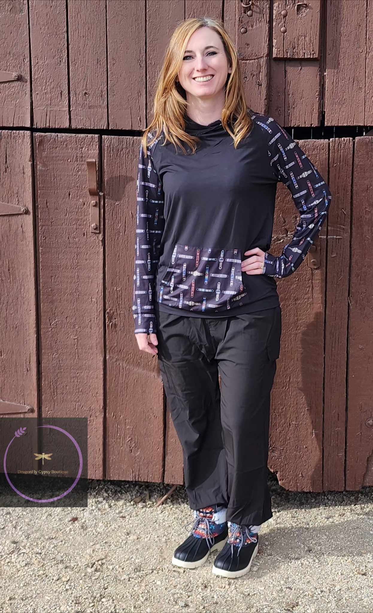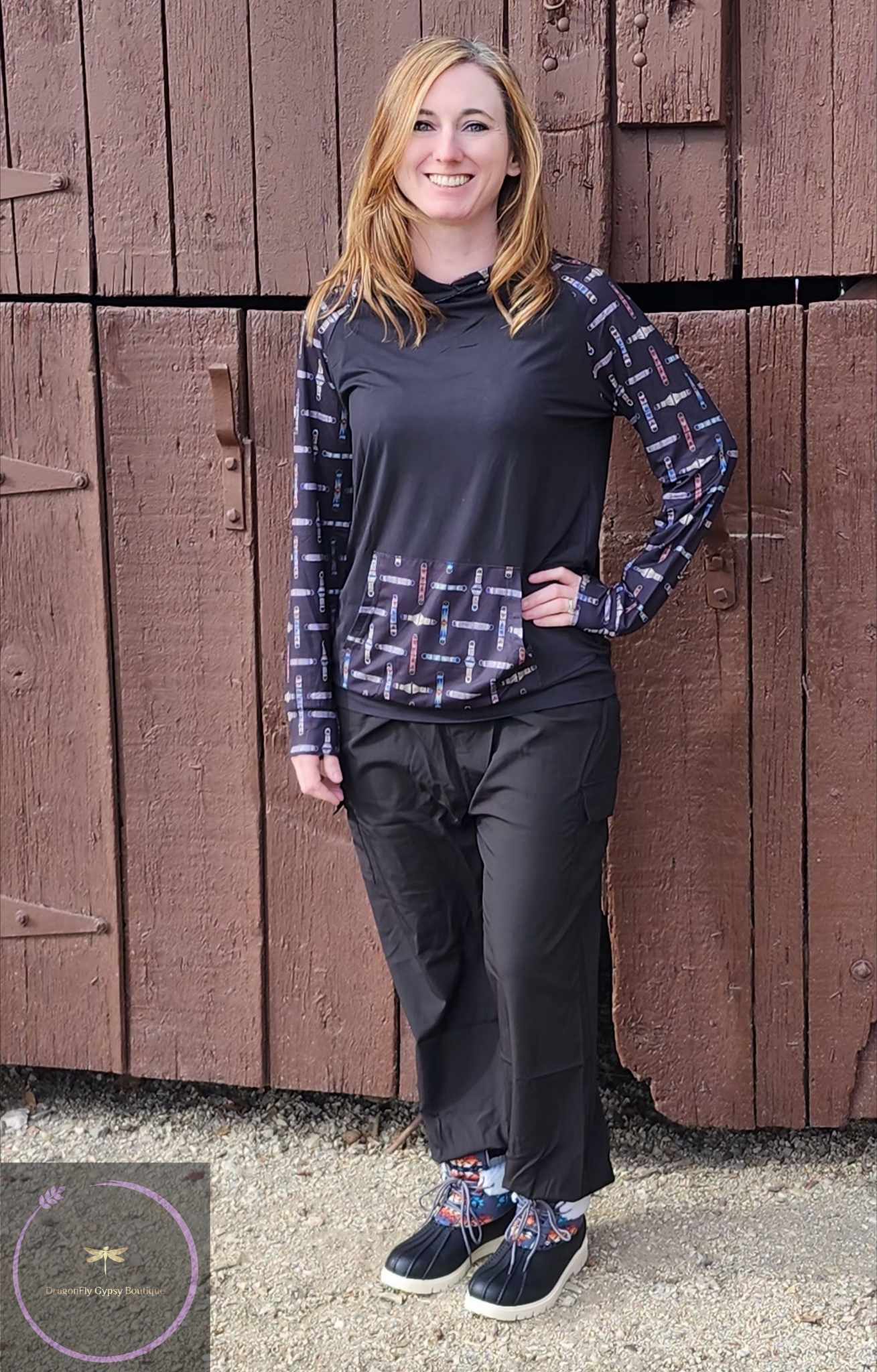 Stay stylish and cozy with our Cinched Up T-Shirt Hoodie. This black hoodie features a unique cinch design on the arms, pouch, and hood. Perfect for adding a touch of quirkiness to any outfit (and keeping your hands warm too)!