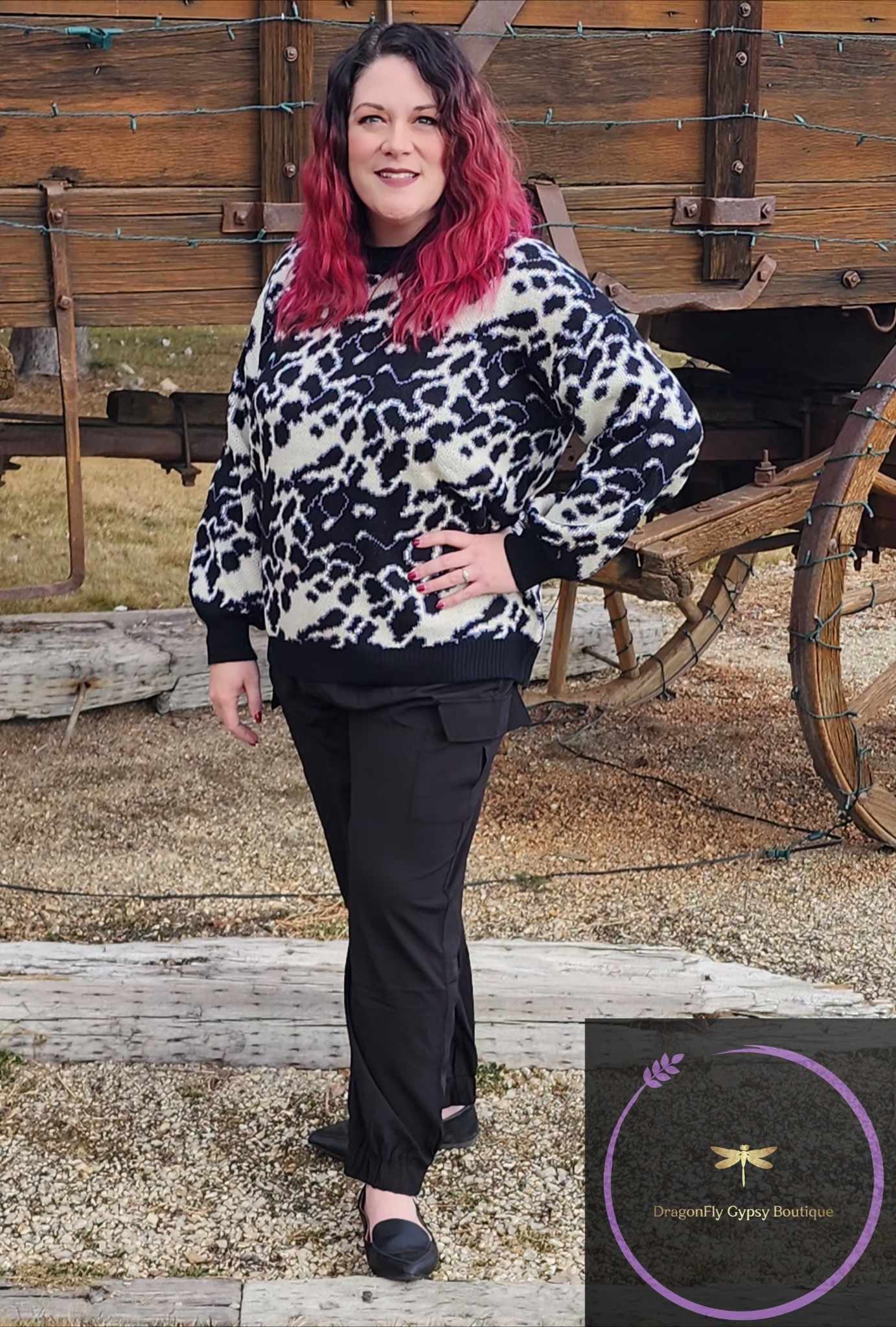 Stay on top of the style herd with the Roaming Hills Sweater! This delightfully cozy cow-print sweater is sure to make heads turn! Perfect for that country-chic look, this one-of-a-kind piece is sure to become your fresh meadow of fashion!